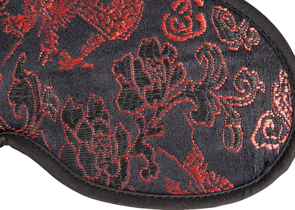 3-piece bondage set made of satin with a pattern! 3-piece set made out of black satin with a red woven pattern: handcuffs with hook-and-loop fasteners, blindfold and flogger (complete length 38 cm) with imitation leather tails. Material: polyurethane, textile: 100% polyester, metal.