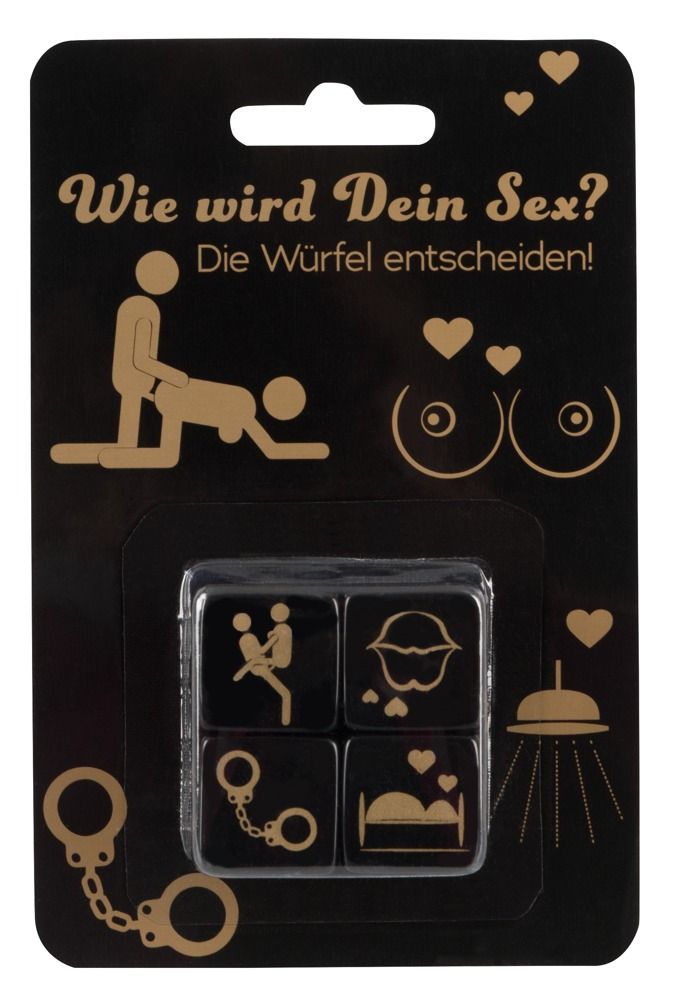| Mærke | The dice decide how and where to have sex! A set of 4 black acrylic dice (25 x 25 x 25 mm) with gold-coloured pictures on them. The pictures are of a position |