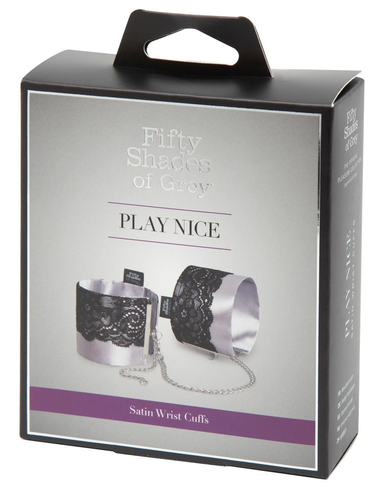 Smukke begrænsninger til spændende spil, der er ud over det sædvanlige! De elegante Play Nice Satin & Lace Wrist Cuffs fra Fifty Shades of Grey har en aftagelig forbindelseskæde med karabinhager. De komfortable håndjern er lavet af sølvfarvet satin, som er dekoreret med sarte øjenvipper. Omkredsen af håndjernene kan justeres.