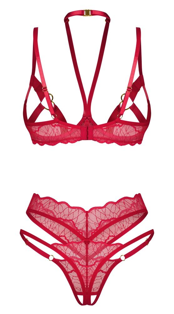 Revealing attraction in a sensual red colour! The crotchless set, Cupide Desir from Obsessive, contains a bra and string. The set is in a delicate lace look in a sensual red colour with gold-coloured details. It is soft and stretchy for a very comfortable fit. The bra has a modern and adjustable halterneck. There is a discreet decorative detail between the open cups. The cup straps are partially adjustable and they also have decorative hearts for the nipples. The bra straps can also be adjusted to fit. The elaborate string stands out because of its stylish double waistband. The narrow straps at the sides can be adjusted. It is also seductively crotchless.